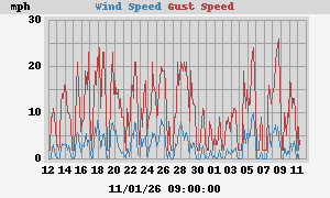 max: 16 mph at 05/01/26 15:36:00 max gust: 26 mph at 08/01/26 15:01:00